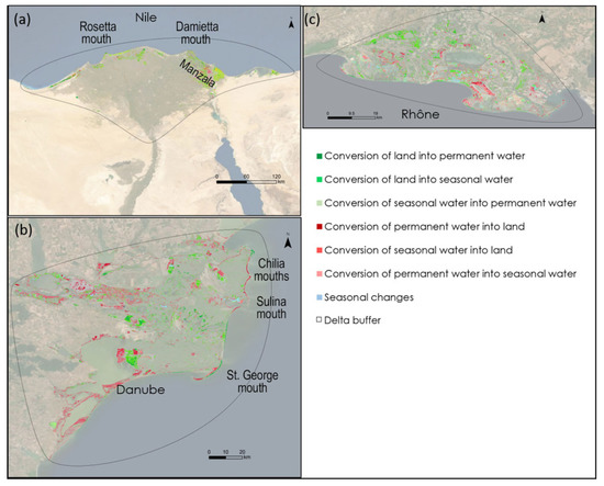 The spatial changes in land and water surfaces in a selection of ten Mediterranean and Black Sea deltas over the last thirty-five years highlight interesting tendencies in land-cover changes, but also vulnerability to subsidence and shoreline erosion. Such data are, thus, useful as tools in monitoring the potential direction of these changes (land-to-water or water-to-land). Trends shown by the coastal zones of the smaller deltas, such as the Arno and Ombrone, clearly point, for instance, to dominant shoreline retreat. However, the use of these land-water data must be considered as just one useful approach that needs to be complemented by more detailed studies devoted to each delta in order to clearly disentangle, within the delta-plain area, changes due to land use, vegetation, especially in wetland areas, and subsidence. A fine example is that of determining how wetlands are to be interpreted in changing land-to-water or water-to-land ratios, not just because wetlands are very sensitive to these variations but also because they are essential ecological elements in these deltas. Moreover, the assessment of change is presented here over a single time block between 1984 and 2019. It would be interesting in future studies to examine how these variations have played out over shorter periods, notably in deltas such as the Danube, where significant changes have occurred within the overall 35-year time span, but also with regards to the eventual restoration of fluvial sediment flux and its effect on delta resilience. The European Union’s Water Framework Directive was enacted in 2000 on the protection, restoration and quality enhancement of European rivers. These objectives are based on a limitation of construction of new hydropower dams, removal of obsolete dams, and strict control of river-bed aggregate extractions.