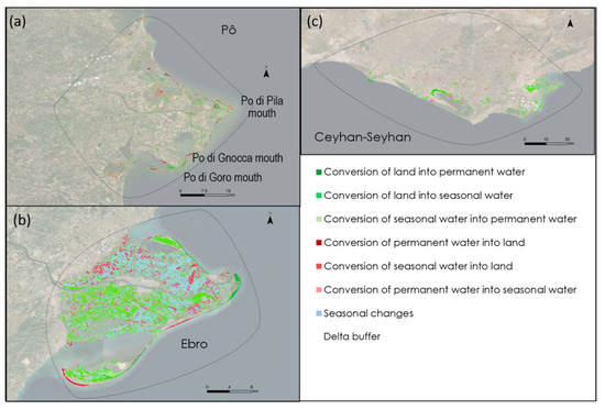 Maps of categories of land→water and water→land conversions for the Po (a), Ebro (b), and Ceyhan-Seyhan deltas (c), culled from the Global Surface Water (GSW) database [7]. The spatial pattern shows relatively strong (78%–91%) delta-plain changes. Basemap: Esri, DigitalGlobe, GeoEye, Earthstar Geographics, CNES/Airbus DS, USDA, USGS, AeroGRID, IGN, and the GIS User Community.