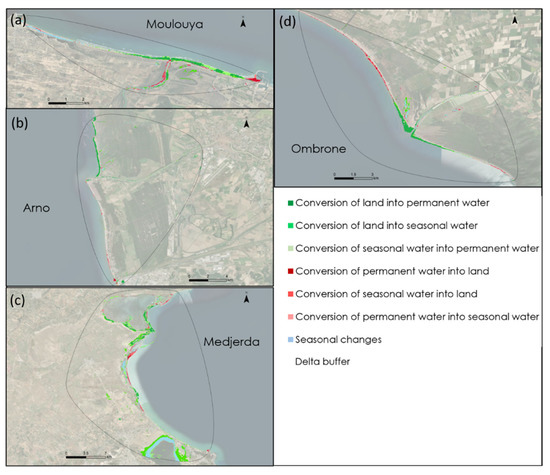 Maps of categories of land→water and water→land conversions for the Moulouya (a), Arno (b), Medjerdja (c), and Ombrone deltas (d), culled from the Global Surface Water (GSW) database [7]. The spatial pattern shows a strong coastal zone component (40%–80%), relative to the entire delta plain. Basemap: Esri, DigitalGlobe, GeoEye, Earthstar Geographics, CNES/Airbus DS, USDA, USGS, AeroGRID, IGN, and the GIS User Community.