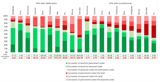 The spatial patterns of land and water area changes over the ten deltas are shown in Figure 3, Figure 4 and Figure 5. The percentages of coastal zone change relative to overall change are shown in Table 2. Spatial changes largely dominant on the delta plain (95%–98%), compared to the coastal zone, are displayed by the Nile, the Danube, and the Rhône (Figure 3), and to a lesser degree by the Po (78%), Ebro (91%), and Ceyhan-Seyhan (91%) deltas (Figure 4). Significant changes in the coastal zone relative to overall delta change (Table 2) are characteristic of the smaller Ombrone (81%), Arno (75%), and Medjerdja (41%) deltas (Figure 5), but the larger Moulouya delta is also in this category (61%). The areas covered by these two spatial categories, delta plain and coastal zone, are depicted in Figure 6. The results show that, with the exception of the Danube, all delta plains are characterized by greater conversion of land into water than the other way round. The rankings in terms of overall water and land conversions show the most significant levels of conversion from land to water (L→W), including land into permanent water (L→PW) in the Arno, with, respectively, 89% and 69%, followed by the Ceyhan-Seyhan, respectively, with 72% and 55%. The Merdjerda and Moulouya deltas show high L→W levels of 78% and 75%, but a more seasonal pattern with only 32% and 36% of LPW. Only the Danube shows a higher water to land (W→L) change than L→W, with only 10% of LPW, although this level is lower in the Ebro (5%) and the Rhône (7%). The results are similar for the coastal zone, but rates of L→W conversions exceeding 50% are shown by all the deltas except the Danube (Figure 6). The coastal zones of the Moulouya, Ceyhan, Arno, and Nile show a trend towards more water areas that exceed 70%. The values decrease gradually but are above 50% in the Ombrone, Ebro, Medjerdja, and Rhône.