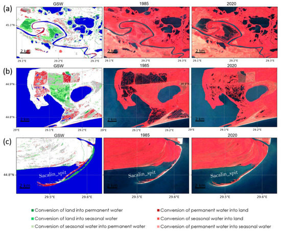 Examples of GSW changes in the Danube delta between 1985 and 2020: (a) changes due to rewilding, meander cuts, and sediment supply on the Saint George branch; (b) changes due to land use and vegetation in the southern delta; (c) changes associated with the coastal dynamics of the Sacalin spit. Based on median Landsat images of all available cloudless images of each year.