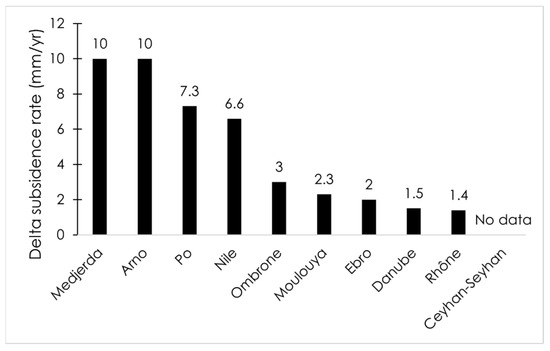 Deltas with the largest protrusion losses are not those currently exhibiting the highest subsidence rates and there was no clear relationship between the 30-year loss in protrusion area and current subsidence rates [8]. However, these reported subsidence rates (Figure 8) need to be considered with caution, given the potentially large variability of this process in deltas and the difficulty of adequately gauging it. The highest subsidence rates are found in the Arno, for which the L→W change has essentially concerned shoreline retreat rather than the delta plain, where subsidence should normally be more pronounced. Compensation for subsidence no doubt takes up some of the subsisting fluvial sediment supply to the deltas, especially the fine-grained over-bank sediment. The Medjerda probably illustrates the moderating effect of a still relatively sustained sediment supply, despite dam construction, on a high subsidence rate of 10 mm/year. However, in some of the alluvial plains of these Mediterranean deltas, the possibility for river sediment flux to balance subsidence is being progressively curtailed by an increase in elevation of artificial channel embankments, as in the case of the Po.