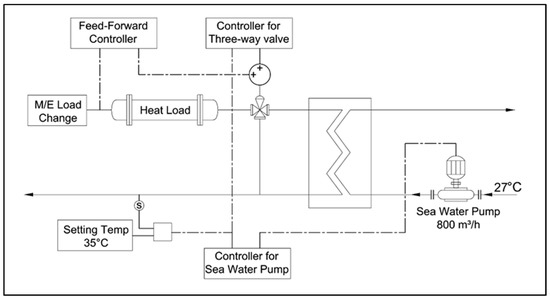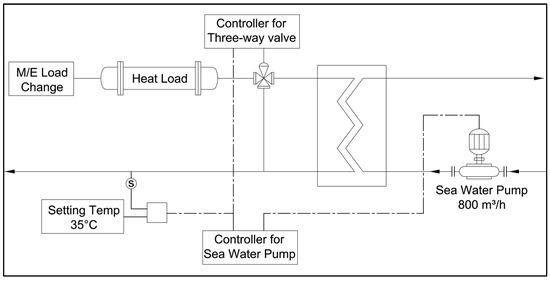 International oil prices have risen gradually since the first two oil price crises in the 1970s. Fuel prices have increased to approximately 40% of a ship’s operating costs, thereby substantially impacting the shipping industry. Consequently, each shipping company has made various efforts to save energy. Such efforts include installing a seawater pump as a variable-speed pump in the new construction phase or by additionally installing a variable-speed control device to the existing seawater pump of an old ship [1,2,3,4,5]. Seawater supplied by the seawater pump is used majorly to recover waste heat from the cooling water of diesel ships. In this process, fresh water (cooling water) recovers waste heat from various heat sources in the ship and transfers it to seawater through a central cooling water cooler. Thereafter, it discharges the waste heat overboard [6,7]. To maintain a constant temperature of the cooling water supplied to the cooler of each part of the ship, waste heat is discharged by installing a three-way valve and a controller in the central cooling water cooler and by adjusting the opening of the three-way valve according to the cooling water temperature on the outlet side of the three-way valve [8]. A three-way valve is adopted as a remedy of the temperature reversal in the water storage tank and a two-stage flowrate is implemented as the flowrate control strategy [9].