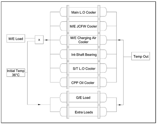 The load change (ME Load) is the input to the load side of the “M/E LO Cooler,” “M/E Charging Air Cooler,” “Int-Shaft Bearing,” “S/T LO Cooler,” “CPP Oil Cooler,” and “MGO Cooler for M/E SCR Blower Unit,” whereas the temperature is the output from each heat exchanger.