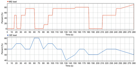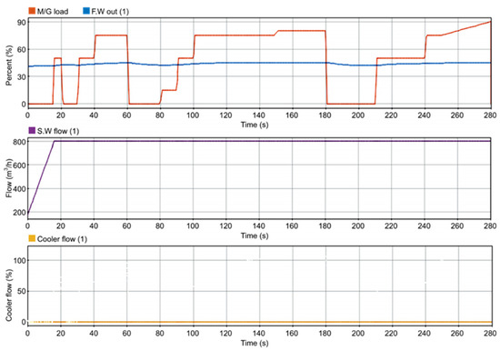 For example, the operation time of the main engine and the generator load was set to 280 s, but it does not operate as such in the actual operation of a ship. The duration of departure is from 0 to 100 s, and from 100 to 180 s is the R/up Eng’ section of normal voyage. In addition, at 180 s, the load of the main engine was suddenly dropped, and the load section was set to prove the effectiveness of the feed forward PID controller proposed in this paper. In addition, this was set up to re-verify the effectiveness of the proposed controller by increasing the load step by step from 180 s to 240 s.