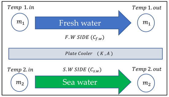 The heat exchanger to be covered in this paper will utilize a plate-type cooler that cools the temperature of the ship’s cooling water using seawater [18,19,20,21]. Figure 2 demonstrates the configuration of a plate heat exchanger that performs heat exchange between fluid and fluid and a temperature controller to maintain the cooling water temperature.