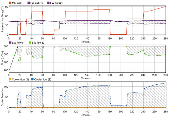 As with the model ship, it can be seen that the flow rate of the seawater pump is operated with the flow rate fixed at 100% due to the interference between the variable- speed seawater pump controller and the three-way valve controller. The opening of the three-way valve is controlled such that it is slightly opened towards the cooler.