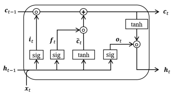 where , denote weight matrices and denote bias vectors. Sig and tanh are smooth step functions and hyperbolic tangent functions, respectively. denotes the Hadamard product. The output of the LSTM module and will be the input of the LSTM module at a subsequent time and is also the input of the Gaussian approximation module. summarizes the parameters of the LSTM module as follows: