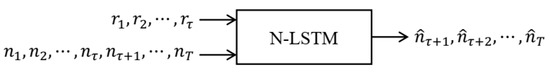 One sample for training the N-LSTM consists of a real significant wave height observation sequence and a significant wave height numerical prediction sequence , where T indicates the sequence length. The training procedure with respect to the sample is under the assumption that the input of real observations is available for the measurement time , but the unavailable time . In this scenario, the significant wave height predictions obtained as described in Section 2.4 are used for representing the measurement time