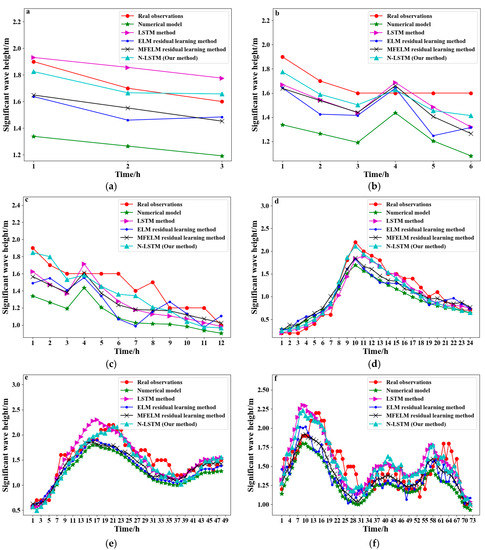 Wave numerical predictions and significant wave height predicting results from the LSTM method the ELM residual method, the MFELM residual learning method and our method: (a) Three hours; (b) six hours; (c) 12 h; (d) 24 h; (e) 48 h; (f) 72 h.
