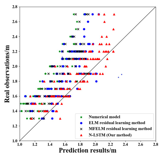 Figure 7 shows the scatter plot of the significant wave height prediction results in which the real observations are between 1.25 m and 4 m. In the plot, the diagonal indicate 100% accuracy. The scattered points close to the diagonal reflect accurate predictions and those far from the diagonal inaccurate ones. In Figure 7, the numerical model prediction results are concentrated on the upper left of the diagonal. It means that the correct results for the numerical model are always smaller than the real observations. The prediction results obtained by our method are closer to the diagonal than the results obtained by the ELM residual learning method and the MFELM residual learning method. In particular, the predictions of the numerical model have a large deviation and the prediction effectiveness of the other two ELM methods is poor when the significant wave heights are higher than 2 m. In contrast, our method maintains a good prediction of this situation.