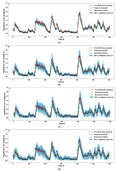 In addition to calculating the prediction results of the wave height numerical model, our method obtains the confidence interval of the prediction wave heights in the form of Monte Carlo sampling [45] and obtain probabilistic forecasts of wave heights in the future. Figure 8 shows probabilistic predictions for the forecasting time of 1–3 h for the nowcast and 48 h for the long forecast and made 600 h of consecutive predictions. The black scatters shows the real observations. The green line shows the numerical model predictions. We plot prediction results from our method as red line along with eighty percent confidence intervals (shaded area). The confidence interval represents the probability interval that real wave height observations fall between the predictions.