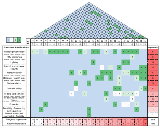 As shown in Figure 1, baseline 1, the functional architecture definition is the expected product of this stage. A particular effort was made by the hardware development team, alongside the client, to identify which system functions were relevant regarding hardware and software. Such identification required using tools described in engineering design and SE literature [54,58], such as Product Design Specification and Quality Function Deployment (QFD). The implementation of these elements was made by the main design team, and is described in [59]. Concept generation tools were used to provide possible solutions, such as low-resolution prototypes, breadboard circuits, cardboard models, among others. A cooperative/iterative effort between the client, which in this context played also the role of user, and the development team, led to a list of requirements. Additionally, an extensive engineering characteristics list was built. The former represents qualitative aspects of the desired solution; the latter is associated with quantities that serve as quality indicators. Requirements help the design team to identify which engineering characteristics are to be prioritized. A tool commonly associated with a QFD, known as the House of Quality (HoQ), was used to rank such characteristics by quantifying the influence of the requirements on them. An HoQ was built for the whole ROV system, but it is beyond the scope of this paper. A reduced view, focused on displaying hardware-related elements is shown in Figure 2. One of the main benefits of the HoQ is that the customer’s needs and Engineering Specifications (ES) are established. This exercise led to the ranking of requirements and engineering characteristics for the hardware systems. The most influential requirements are power reliability, illumination, security, and maneuverability. The following list contains the ES for the HoQ: