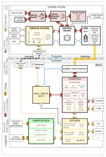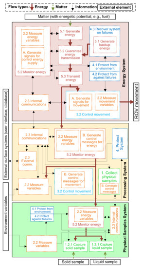 From the electrical and software systems perspective, a classification exercise was done to filter which functions had to be performed using hardware and software. Such effort rendered that all the top level functions are related to hardware and software, and can be divided into specific subfunctions. The next step was to connect each subfunction using energy, matter, and information flows, according to a product engineering perspective [58]. The resulting diagram is called Systems Architecture, which is shown in Figure 4 for the ROV Pionero500. This tool represents an important step towards physical implementation of abstract functions, since it allows transitioning from functional decomposition to physical architecture. Once flows are established, boundaries between systems can be drawn. In this case, three systems were declared for the underwater vehicle: Energy, Processing, and Physical Samples.