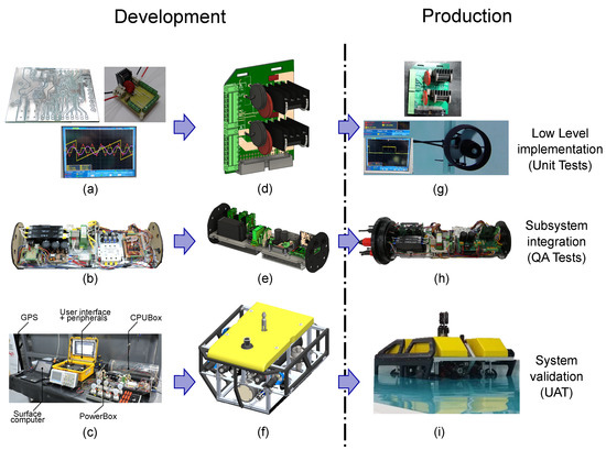 Development and production of Power Box. (a) Thruster module concept prototype, (b) Power Box concept prototype, (c) System integration concept test, (d) Thruster module low level design, (e) Power Box design, (f) First ROV vehicle design, (g) Thruster module production and test with thruster, (h) Power Box production, (i) ROV vehicle laboratory test.