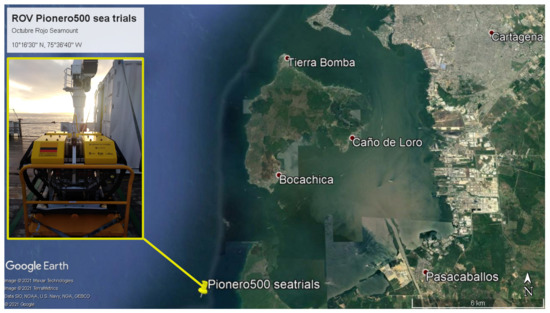 The operational stage for Pionero500 only involved the first sea trials carried out in 2018 near Cartagena, Colombia (Figure 7) on board of the research vessel ARC Roncador, which is managed by the General Maritime Directorate of Colombia (DIMAR) through the Caribbean Research Center for Oceanographic and Hydrographic Research (CIOH). This was done thanks to an academia-government-industry alliance to conduct research, development, and innovation in marine sciences and technologies, funded by the Newton Fund and the Royal Academy of Engineering from the UK, that allowed the research team to join a cruise in which different technologies for ocean exploration were being evaluated. This partnership included several types of stakeholders and was very useful to feedback the design of the operational characteristics of the ROV system.