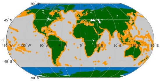 GOW2 mesh domains. Grey: global (0.5 × 0.5 degrees), blue: Arctic and Antarctic (0.25 degrees latitude × 0.5 degrees longitude) and orange: coastal mesh (0.25 × 0.25 degrees).