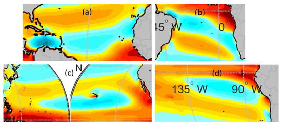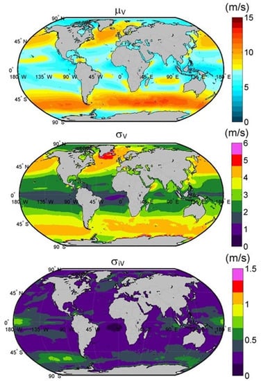 Figure 2 shows the global distribution of parameters . As can be seen the global distribution of μV shows two clear maxima around the polar front belts, more pronounced in the southern hemisphere (SH). Other less pronounced maxima appear in the trade wind belts, more noticeable the one in the Indian Ocean. Local maxima, associated to monsoons or special land-sea features can be seen in the East and South China Seas around Taiwan, in the Indian Sea near the Horn of Africa and in the Caribbean Sea, to the north of Guajira and Paraguaná peninsulas (in the following the Caribbean Spot). These features of global winds have already been reported by other authors [,,].