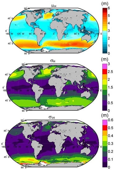 Global distribution of: mean significant wave height, μH (top), standard deviation of the significant wave height, σH (centre) and inter-annual standard deviation of significant wave height, σiH (bottom).