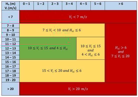 Figure 5 summarizes the sailing operational ranges. The optimal range is indicated in green, the suboptimal in yellow and the non-operative conditions in red. In the following, the operation range that sum up the optimal and suboptimal ranges will be called operability range.