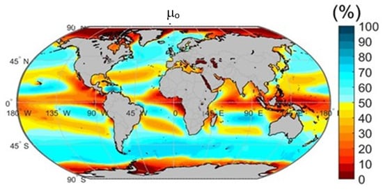 Figure 6 shows the global distribution of, µ0. As can be seen there are four great areas having µ0 over 50%: The polar fronts and the trade winds belts. Additionally, there are other smaller local areas of high µ0 in the East and South China Seas around Taiwan Island, in the southeast of the Vietnam coast, in the Indian Sea near the Horn of Africa, around Ceylon Island and in the north and south tips of Madagascar Island, associated with monsoons. This results closely follow the distribution of the mean wind velocity, indicating the prevalence of wind over wave conditions on the mean operability of energy ships.