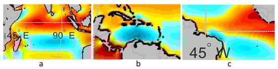 Trade wind areas with annual mean operability over 75%. (a) Indian Ocean. (b) Caribbean Spot and (c) North-eastern Brazil. Color scale is the same as Figure 6.