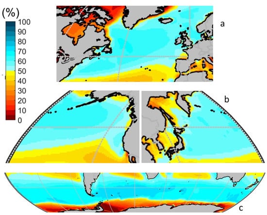 Polar front belts mean annual operability µ0. (a) North Atlantic, (b) North Pacific, (c) Southern Ocean.