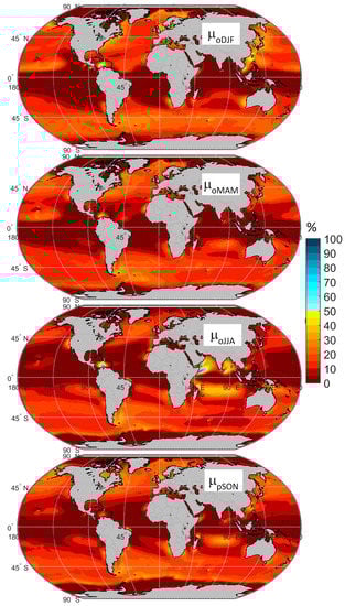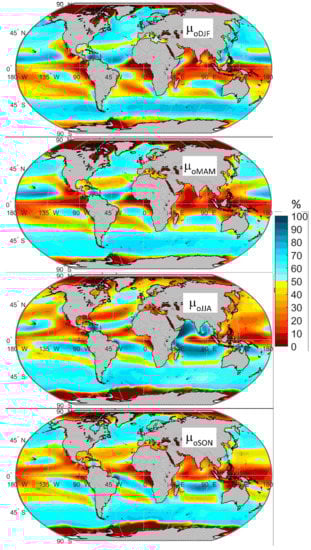 The global distribution of the seasonal mean operability, µ0(season) is obtained by calculating in each database node the percentage of sea states in the operation range during each season: December–February (DJF), March–May (MAM), June–August (JJA), and September–November (SON). Figure 10 shows the global distribution of the seasonal operability for the four seasons.