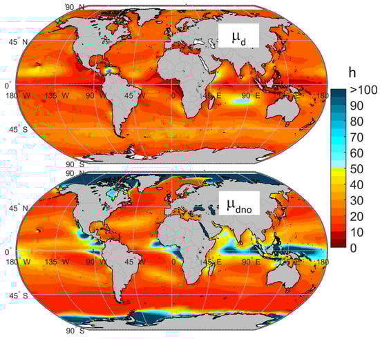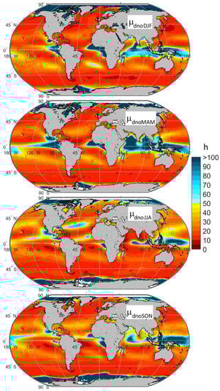It is noticeable the large seasonal variability in the Indian Ocean affected by the Asian monsoon as in the Bengal and Arabian seas. In the trade wind belts, the seasonal variability of µdno is smaller, with a general N-S displacement in latitude of the areas with minimum µdno durations. The largest areas of minimum µdno durations (5–10 h) occur during the NH spring (MAM) in the Western part of the North Atlantic trade belt and also during the SH spring (SON) in the central part of the Indian Ocean, in the Western part of the South Atlantic Ocean and in the eastern part of the South Pacific Ocean trade belts.