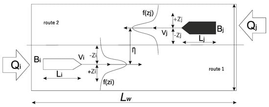 where the parameters are described as follows: is the length of the route, is the number of passes of class ships in a unit of time on route 1, is the number of passes of class ships in a unit of time on route 2, is the average speed of class ships on route 1, is the average speed of class ships on route 2, denotes the width of class ships, denotes the width of class ships, is the distance between the center lines of navigation routes and denotes the average deviation of ships during navigation from the center lines of navigation routes. Figure 1 also describes the scenario of overtaking collisions which implies that ships move in only one direction, and the number of collision candidates is calculated so that in Equation (3) the sum of average velocities is replaced with the absolute value of the difference between these velocities .