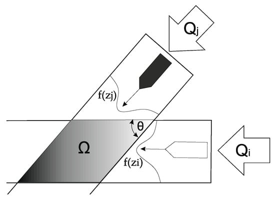 The model based on the collision theory of molecules [] refers to a crossing collision scenario. Ships on a waterway are homogeneous groups where each ship is the same size and each ship has the same speed. A ship approaching a waterway that is being intersected with the ship’s course line at the angle is considered, and the average free distance that the ship can cover on average before colliding with one of the ships on the waterway is defined. According to this model, the geometric probability of a collision is defined as