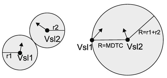 In the model in [], instead of the collision diameter, the concept of “Minimum distance to collision” (MDTC) is used and calculated under the assumption that both ships take a collision avoidance maneuver in a situation where they may be considered as collision candidates. A collision candidate arises if the distance between the ships is not sufficient to take a collision avoidance maneuver. The distance and time required to undertake avoidance maneuvers depend primarily on the hydrodynamic and maneuvering characteristics of the ship type. The implementation of collision avoidance maneuvers in the collision probability assessment model first appears in the research of [], but this model was limited to only one ship type, and the head-on and overtaking collision scenario. This model includes four types of ships of different sizes with the assumption that they move at their maximum speeds, sail on the high seas and start a collision avoidance maneuver at the same time. This model is based on the molecular collision model used in air traffic to estimate the number of aircraft collisions []. The ship is represented by a point in the middle of the circle which is considered to be an area where the appearance of other objects (ships) is not allowed, the so-called “no-go area” (Figure 3).