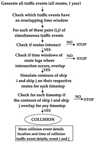A model [,] was developed to estimate the ship collision frequency while simultaneously predicting the location and time of the collision within the simulated time period. The model is based on the microsimulation of ship traffic within the geographical navigation area “Gulf of Finland” using the Monte Carlo simulation technique. The number of collision candidates and the locations of such collisions are calculated (causation probabilities from the literature are used to predict the actual number of collisions). The navigation of each individual ship is simulated in the time domain. Input data for the simulation, such as routes, structure and the number of ships on individual routes, sailing durations, ship sizes and speeds were collected from the AIS data of the Gulf of Finland navigation area. It should be emphasized that it is possible to enter input data and perform a simulation without AIS data. The model is based on the concept of the so-called “traffic event”. The voyage of each individual ship with the associated characteristics (length, width and type of ship, departure time, sailing route and speed of the ship) from the starting point to the destination is called a “traffic event”. The simulated time is one year, and “traffic events” are generated for each individual route, the number of which corresponds to the volume of annual traffic on that route. The corresponding characteristics of each individual “traffic event” are randomly selected based on the input distributions generated using AIS data. One set of generated “traffic events” represents one possible traffic situation during a year (one representation of a stochastic process). Collision candidates are predicted based on the generated set of “traffic events” assuming that the ships do not perform any maneuvers to avoid collision. The collision detection algorithm analyzes one representation of the stochastic process to find those combinations of “traffic events” in which the contours of the ships overlap at least at one point in time; the ships are in the same location simultaneously, and the model declares a collision. The collision detection algorithm is shown in Figure 5.