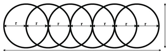 In [], ship collision frequency models for two different scenarios are proposed. One of the scenarios considers the sea surface in the form of a circle in which ships move randomly, while the other scenario considers the sea surface in the form of a square in which ships move in predetermined fixed directions. Let be the radius of a very small circle (the area within which it is possible to place a ship of average dimensions) that is of negligible size in relation to the considered sea surface represented by a circle or a square. Both models calculate the number of “dangerous encounters”. If the distance between two ships is less than the radius , it is considered that a “dangerous encounter” has occurred. For the circular sea surface scenario where ships move in random directions, the number of “dangerous encounters” of one selected ship (one’s own ship) with other ships sailing on the considered sea surface during time is calculated as
