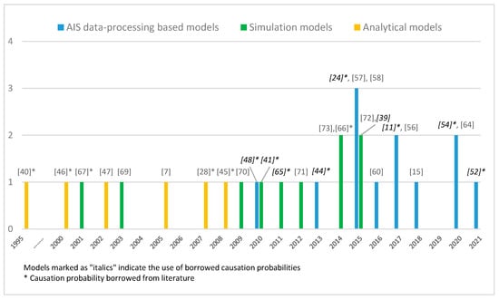 Quantitative ship collision frequency estimation models developed from 1995 until 2021.
