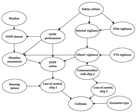 The disadvantages of using FTA in such models are manifested through the exponential growth of the tree structure when adding variables, i.e., “events” whose influence is taken into account when it comes to the occurrence of collisions []. Another disadvantage of FTA is Boolean logic, where states of components are described as binary, and the existence of more than two states is not allowed []. The Bayesian network eliminates these shortcomings, and its use for risk assessment in maritime transport has increased significantly over the last decade [,]. A Bayesian network is a structure composed of directed acyclic graphs consisting of nodes (representing variables), arcs (representing dependencies between variables) and a conditional probability table containing the conditional probabilities of occurrence of each state of the variable. It is said that for each variable that has parent nodes , there is a table of conditional probabilities , and if variable has no parent nodes, probability is assigned to it. Thus, nodes are variables that can have a finite number of different states, and each state can have some probability of occurrence assigned to it. For example, the “Weather” node can have “Good” and “Bad” states. The probability of a node state occurrence can be affected by other nodes (represented by arcs). Historical statistical data and expert knowledge (or a combination of both) can be used to identify relevant nodes and their dependencies, as well as to create a table of conditional probabilities. More details on Bayesian networks can be found in []. One simplified generic example of Bayesian network for modeling and calculating the ship collision causation probability is shown in the Figure 9 [].