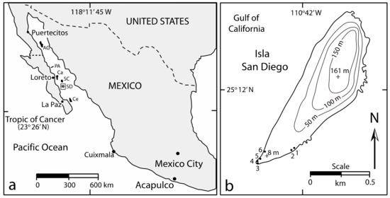 Stretching for more than 1000 km in length (Figure 1a), the Gulf of California is a marginal sea seated over a tectonically active zone that entails spreading centers offset by a succession of transform faults [15]. The central spine of the adjacent Baja California Peninsula is formed by granodiorite, broadly dated to a Cretaceous origin between 97 and 90 million years ago [16]. Upfaulted granodiorite basement occurs on the Baja California Peninsula at Punta San Antonio north of Loreto, on Isla Catalina east of Loreto, as well as Isla Santa Cruz and Isla San Diego (Figure 1a). Peninsular and island development including those areas with granodiorite resulted from Miocene extensional rifting that began prior to flooding 13 million years ago and lasted for 9.5 million years when a change in dynamics initiated transform faults connected with the San Andreas Fault on the US side of the border [1,2,15]. A detachment zone was activated approximately 3.5 million years ago that resulted in half-graben structures separating the islands from the rest of the Baja California Peninsula. The detachment zone that extends from Punta San Antonio to Isla San Diego (Figure 1a) is identified as the Comondú Detachment.