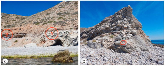 - Johnson, M.E.; Guardado-France, R.; Johnson, E.M.; Ledesma-Vázquez, J. Geomorphology of a Holocene hurricane deposit eroded from rhyolite sea cliffs on Ensenada Almeja (Baja California Sur, Mexico). J. Mar. Sci. Eng. 2019, 7, 193. [Google Scholar] [CrossRef]