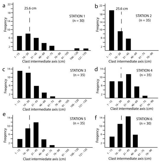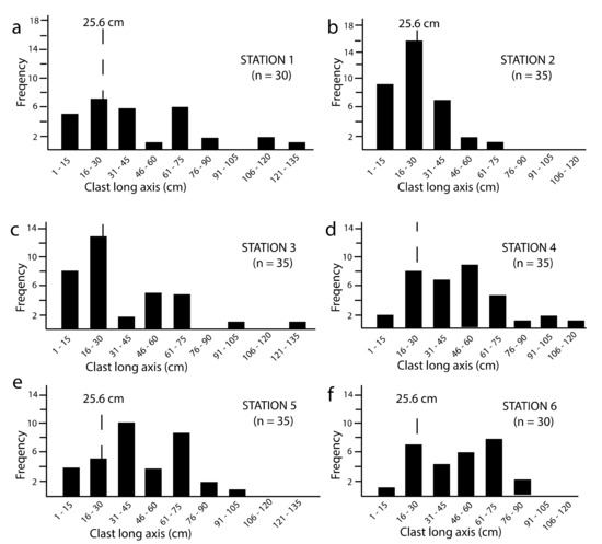 Clast sizes and maximum boulder volumes drawn from the six sample stations are summarized in Table 2, allowing for direct comparison of average values for all clasts, as well as values for the largest clasts in each sample based on Equations (1) and (2) derived from the work of Nott [20] and Pepe et al. [22].