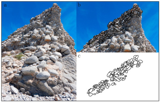 Clast orientation or imbrication within the boulder deposit on Isla San Diego varies according to outcrop exposure, as observed on two vertical planes that intersect perpendicular to one another. One is parallel to the island’s long axis along the eastern shore (Figure 2b and Figure 3a). The other crosses through the island’s southern tip (Figure 3b). Both show direct contact of eroded boulders with underlying granodiorite basement rocks where the conglomerate attains a maximum elevation of 8 m above sea level. The unconformity surface traced parallel to the island’s axis is flat lying with a slight gain in elevation rising to the northeast. In this view (Figure 2b), a change in clast size from boulders to large cobbles begins above a reactivation surface that follows a minor indentation in the cliffs obscured by shadows. Shape analyses indicate that a preponderance of clasts from the basal part of the deposit are ellipsoidal or roughly fusiform in shape (Figure 4), but a small amount of imbrication is detected only below the reactivation surface (Figure 2b). The unconformity surface exposed in the plane crossing the tip of the island (Figure 3b) is more irregular with a dip or swale in the center, but crude layering in the overlying boulder deposit is increasingly inclined with distance above the unconformity. Based on photographic evidence supplemental to Figure 3b, evidence for imbrication is detected in the upper part of the deposit (Figure 7), where this is shown by transfer of outline tracings (Figure 7a,b) and isolated for clearer viewing (Figure 7c). Due to the partial collapse of clasts at the island’s tip, relationships among those in the basal part of the deposit are less clear. However, the orientation of clasts from the upper part of the deposit (Figure 7c) reveals a pattern of imbrication from northeast to southwest.