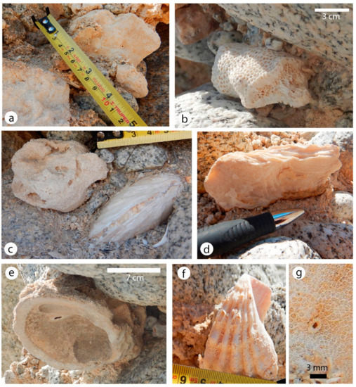 Representative fossils are illustrated by field photos (Figure 8). Two kinds of corals are illustrated: Porites panamensis (Figure 8a) and Pocillopora elegans (Figure 8b), respectively. Articulated bivalves are rarely found as fossils within the boulder beds, with the exception of Codakia distinguenda (Figure 8c), which may have grown in place in cavities among boulders after their deposition. Very thick but heavily eroded shell fragments belonging to a species of oyster (Figure 8d) indicate that shell fragmentation normally occurred prior to burial in the conglomerate. The large and heavily calcified shell of Spondylus calcifer (Figure 8e) is preserved intact but disarticulated. The large pecten Lyropecten subnodosus (Figure 8f) is likewise disarticulated and also broken. The only trace found of fossil gastropods is the distinctive operculum belonging to Turbo fluctuosus. Of ecological note, one of the Porites fossils observed in the boulder deposit at Station 4 (Figure 7a) is host to the boring barnacle Hesareusia durhami (Figure 8g). The same relationship between coral host and barnacle is known from the Pleistocene reef complex preserved intact on Isla Cerralvo [23].