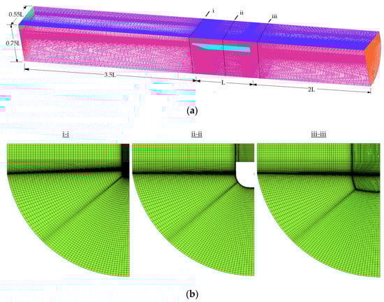 In the CFD computation, the steps of the simulation include designing the computation domain, generating a mesh, and setting up the computed conditions, all of which must be conducted as per the user guideline documents, which have been published as the International Towing Tank Conference (ITTC) manual for applying the CFD code [30,31,32,33,34,35] and previous publications [2,3,4,8,9,20,21,28,30,32,35,36,37,38,39]. In this study, the computed fluid domain has been limited to 6.5, 0.55, and 0.75 L instead of 13 m length, 1.1 m breadth, and 1.5 m height. Meshing the simulated domain in the structured H-grid was generated in 2.63 million grids. The turbulent viscous model k-ω, applied to unsteady flow and the Volume of Fluid (VOF) multiphase model, were used. The inlet and outlet of the computed domain were set up with a velocity inlet and a pressure outlet. In the CFD simulation, the simulated domain should be designed to be large enough for the problem. However, the limited dimensions of the simulated domain affect the size of the mesh, as well as affecting the hardware and the running time. The effects of the limited dimensions of the computed domain on the CFD results will become small if the computed domain is large enough. Therefore, we must design an optimal computed domain and set up appropriate boundary conditions. In this study, the time step was set up to be 0.005 s, and the running time included 6000 time steps. Figure 2 shows the simulated domain and the generated mesh in the H-grid structure used for the computation.
