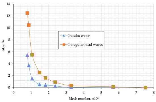 In the CFD computation, the effects of the mesh of the computed domain on the CFD results have been reported in many previous papers [2,3,13,14,15,30,35,39]. Moreover, in the computation of ship resistance in waves, the height and size of the mesh at the free surface of the computed domain determine the accuracy of the incident wave profile. Therefore, we must make an appropriated mesh for the computed domain. In this study, we independently generated results regarding the resistance acting on the hull of the mesh in the computational domain in CFD. Conditions of both calm water and waves have been simulated in different scenarios; at the Froude number of 0.163, the wave height is 0.02 m and wave length is 0.8 m. Table 2 lists details of the mesh of the computed domain and the computed ship resistance coefficients in the different computed cases. Figure 3 shows the curves of the mesh effect on the computed ship resistance coefficients in calm water and in regular head waves.