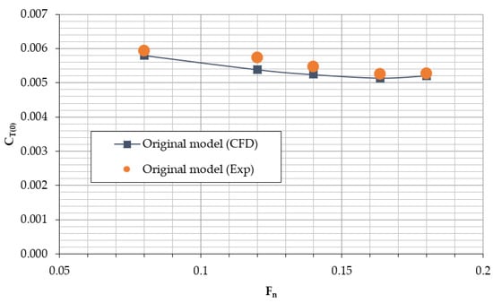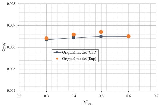Figure 4 and Figure 5 show a comparison between the CFD results of the total ship resistance coefficients and the experimental data, both in calm water conditions and in regular head and short waves. The total ship resistance coefficients in calm water, CT(0), and the total ship resistance coefficients in regular head and short waves, CT(W), are defined by the following equation: