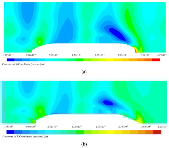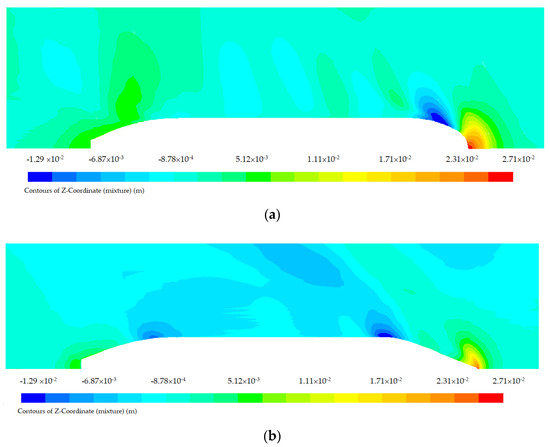 The results, as seen in Figure 9, show a wave pattern at the free surface of the simulated domain when the ships run under wave conditions with a wave height of 0.02 m and the ratio λ/Lpp = 0.4 for the 2 m long model, at the Froude number of 0.163. In the results, the high and deep waves around the ships’ bows are different with and without the developed bulbous bow. Figure 10 shows a comparison of the dynamic pressure distribution over the surface of the ship’s hulls under wave conditions.