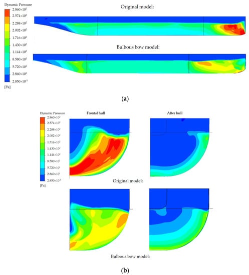 Analyzing the dynamic pressure distribution, as shown in Figure 8, the red and yellow regions indicate high dynamic pressure and the blue region indicates a lower dynamic pressure region over the surface of the ship’s hulls. The results show drastically reduced high dynamic pressure regions over the surface of the ship’s hull with a bulbous bow shape. The effects of the bow shape on the pressure distribution over the surface of the ship’s hull could be evaluated. The effects of the bulbous bow shape on the pressure distribution of the ships may be evaluated by a comparison between the ship resistance in the two cases of the computation with and without a bulbous bow shape.