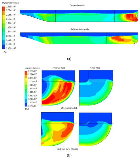CFD results of dynamic pressure distribution over the surface of the ship’s hulls at Fn = 0.163 in calm water conditions. (a) Side view; (b) frontal and aft view.