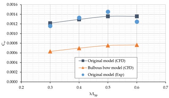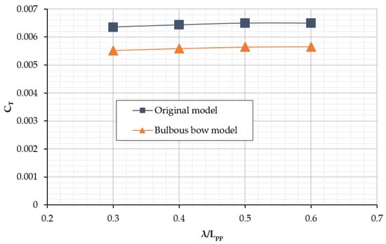 The results of the total resistance coefficients of the ships shown in Table 4 and Table 5 and Figure 11 show that the frictional viscous resistance acting on the bulbous bow model was slightly higher than that of the original model, which may be the result of the larger wetted surface area of the bulbous bow shape. Additionally, the pressure viscous resistance and the total resistance acting on the bulbous bow model were smaller than those of the original model by up to 6%. The reasons for this may arise from the effects of the developed bulbous bow shape.