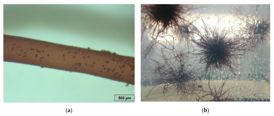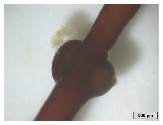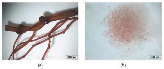 Cystocarp maturation was seen by visible volume increase and format change in the protruding cystocarps (Figure 1a). After cystocarp maturation, all samples were transferred to a climatic room set at 20 ± 1 °C, under a Grolux and daylight combo of 20 ± 0.5 µmol photons m−2 s−1 with a photoperiod set at 16:8 L:D, to induce spore release. Cystocarps in plastic bags (A and B) were transferred to Petri dishes containing seawater supplemented with VSE. After one week, the number of spore agglomerates were counted on a stereomicroscope (Stemi 2000-C, Zeiss, Oberkochen, Germany), as the abundance of spores made direct count impossible. The criteria adopted to quantify agglomerates defined an agglomerate as any group of spores large enough to be easily identified by the naked eye, corresponding to at least 100 spores. Each of these was marked as an agglomerate (Figure 1b). Quadruplicates were performed for each assay.