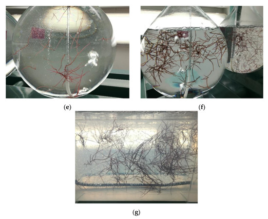 Growth and development of Gracilaria gracilis sporelings throughout six months in culture, showing biomass with (a) one month, (b) two months, (c) three months, (d) four months, (e) five months, and six months in (f) flat-bottom flasks (100 mL, 250 mL, 500 mL, 1 L, 2 L and 5 L, respectively), and (g) tank (50 L).